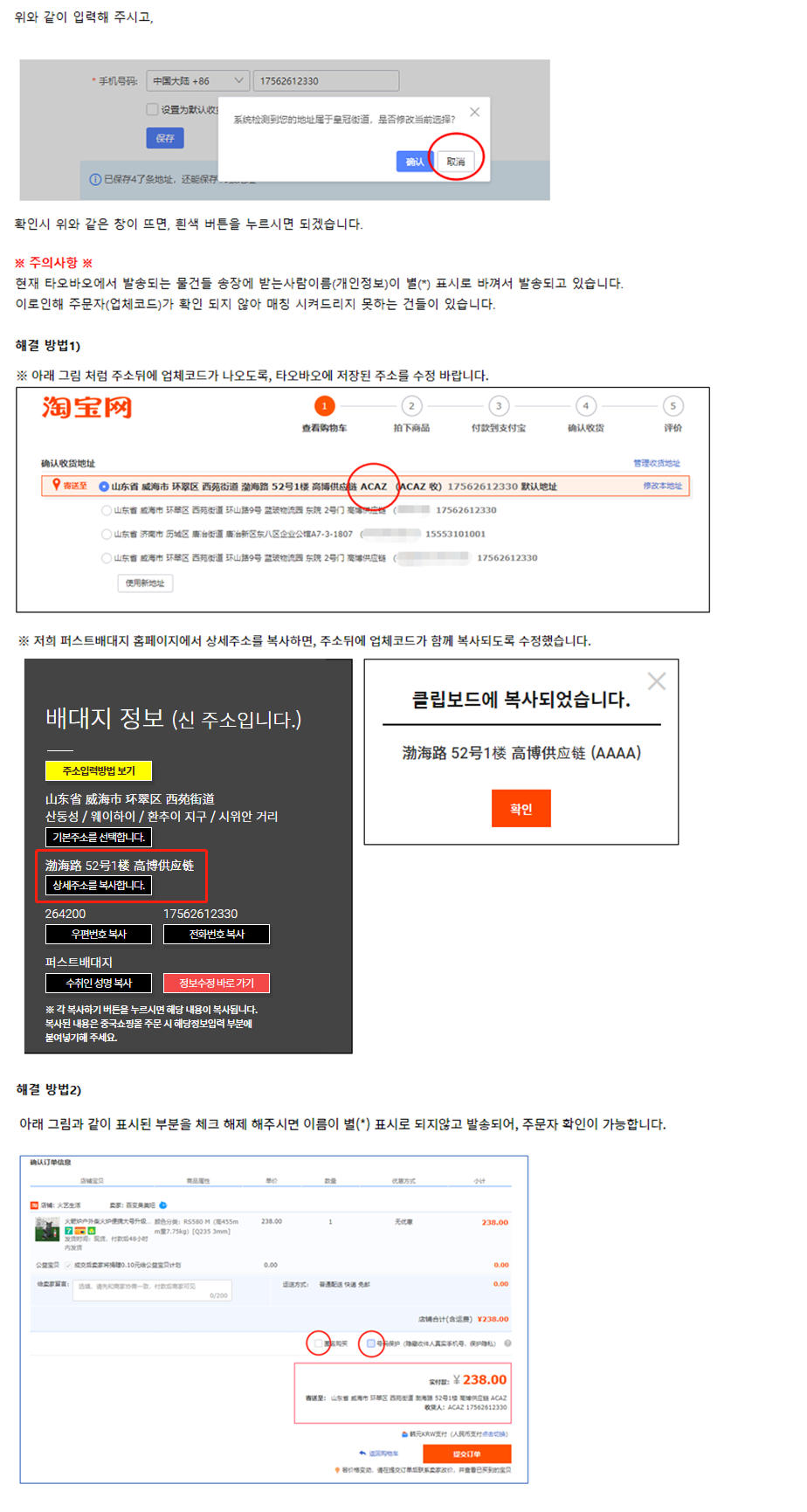 타오바오 수취인 정보에 아래 그림처럼 입력해 주세요.